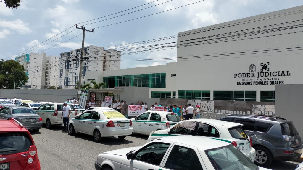 Cancún.- Un grupo de cerca de 60 taxistas del sindicato “Andrés Quintana Roo” se manifestaron de manera pacífica en sus vehículos afuera de los Juzgados Orales Penales ubicados en la avenida Nichupté, para exigir la liberación de su ex líder interino, Salomón Alfonso Muñoez, alias “Maffer”, encarcelado hace nueve meses, acusado de homicidio.