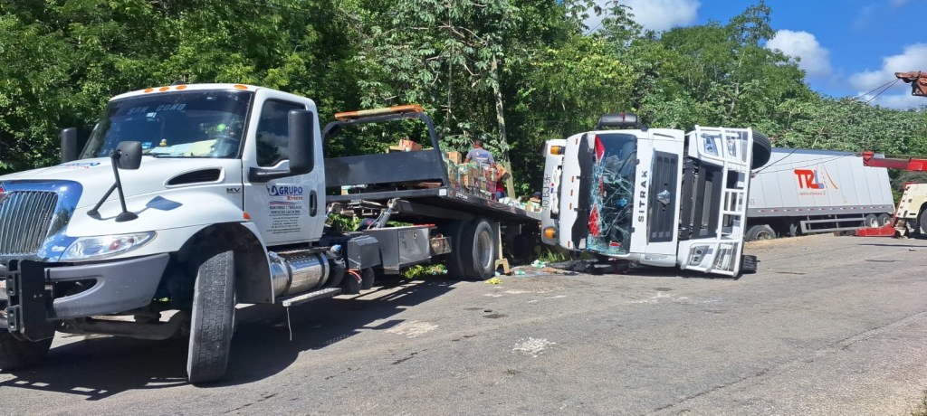 Este vehículo, de la empresa “Logística Alimentaria” ingresaba a Playa del Carmen por la mencionada carretera de paga, cuando, a corta distancia de la estación del Tren Maya, una de las llantas golpeó un registro elevado a un costado de la cinta asfáltica.