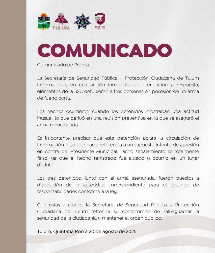 Tulum.- Tres personas fueron detenidas esta mañana, luego que presuntamente una sacara un arma de fuego, durante un recorrido que realizaba Diego Castañón Trejo, presidente municipal de Tulum, en la zona centro de la ciudad. Pese a los testimonios de gente presente, el Ayuntamiento niega que esto haya ocurrido.
