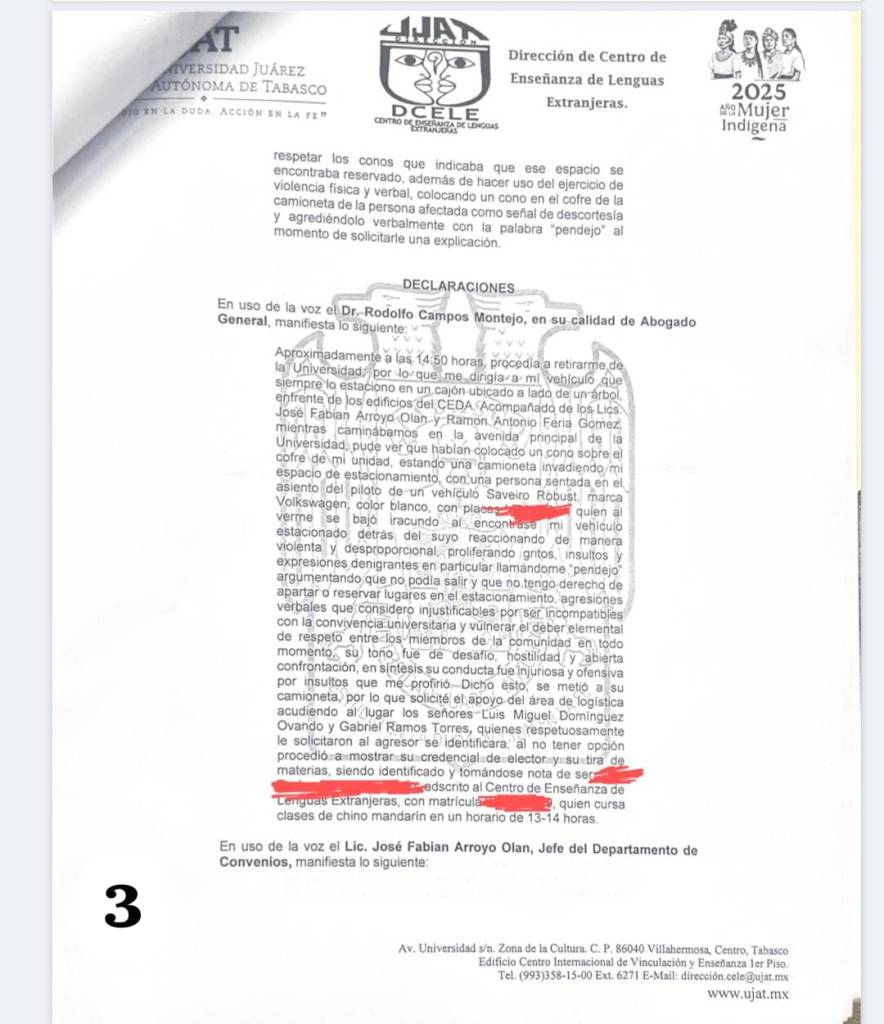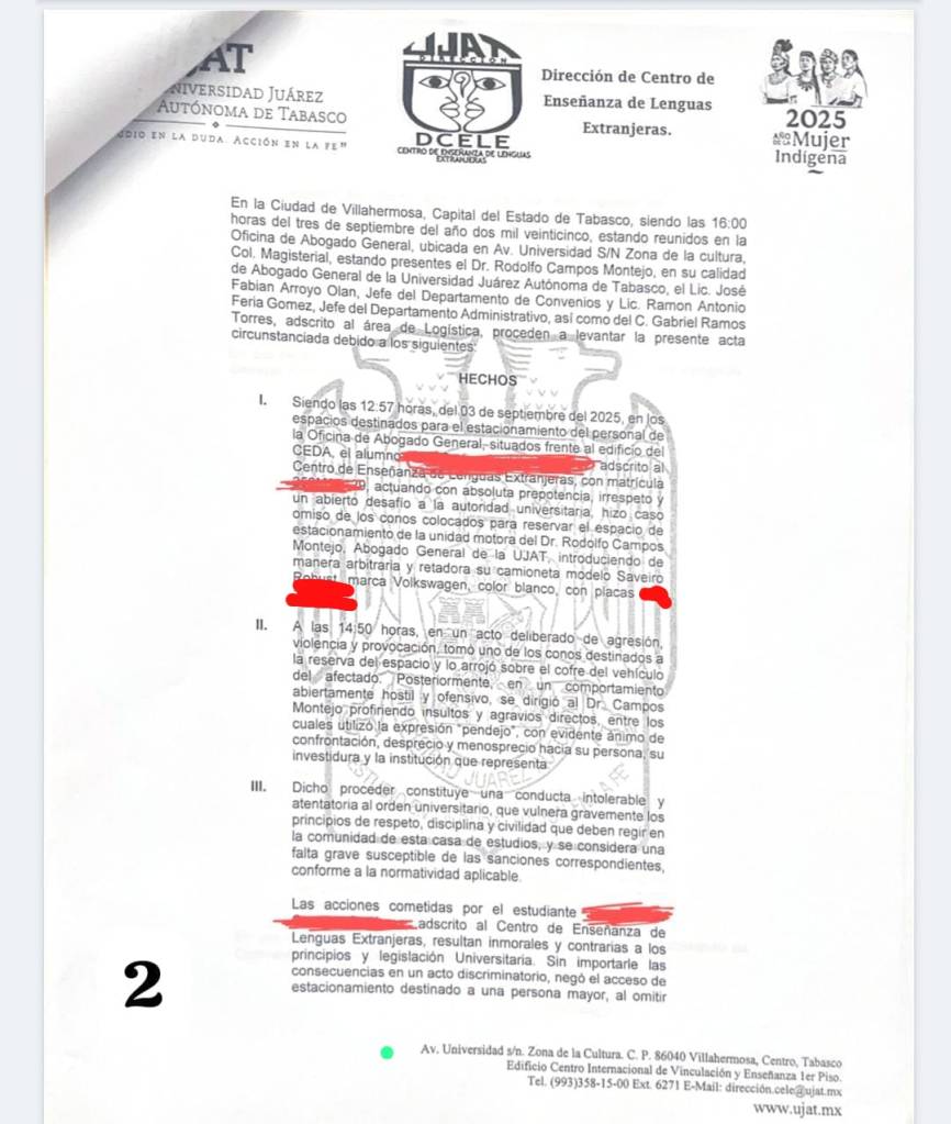 Agencia IDMx// Villahermosa, Tabasco, México.- En un acto a toda luces de abuso de Poder, el Abogado General de la Universidad Juárez Autónoma de Tabasco, Rodolfo Campos Montejo, expulsará a un alumno por el hecho de haberse estacionado en «su» cajón; por el momento lo ha suspendido dos meses.