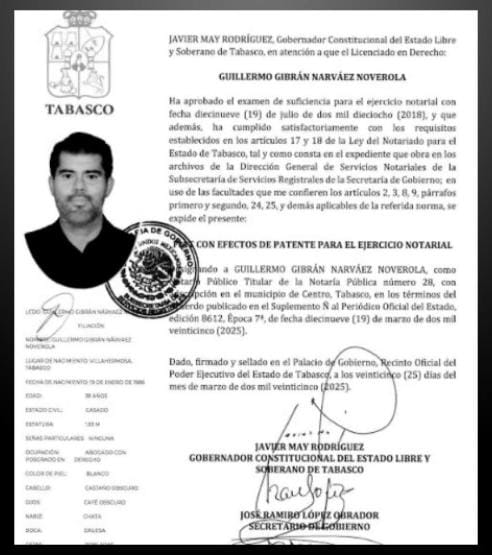 En el documento, público, que obra en nuestro poder, y que aquí compartimos, se leé que luego de haber realizado los trámites legales correspondientes, y cumplido con los requisitos, se le otorga la calidad de fedatario público, y ejercer esa función desde la Notaría Pública Número 28; la cual no debe pasar inadvertido que le fue otorgada inicialmente a su padre, Guillermo Narváez Osorio, y por varios años la ejerció su mamá Aura Estela Noverola. Todo quedó en familia.