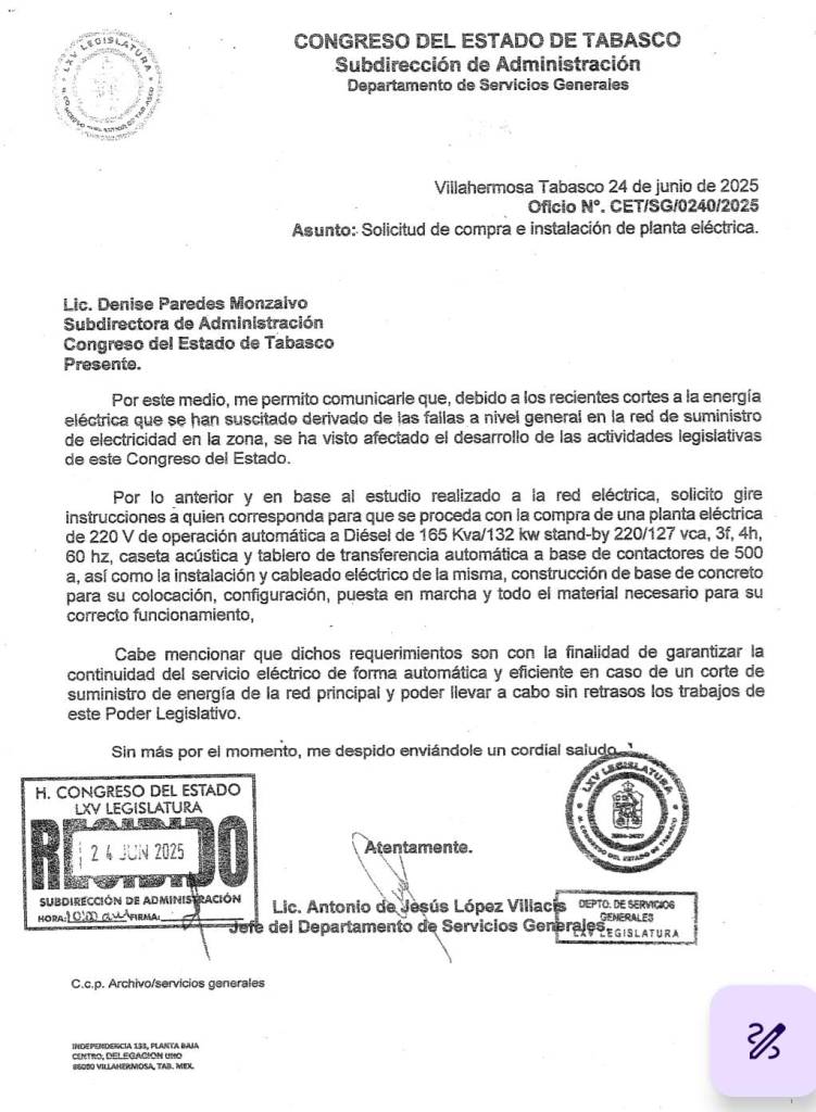 El pasado 24 de junio del presente año, el Jefe del Departamento de Servicios Generales de la Cámara, Antonio de Jesús López Villacis, envía el oficio número CET/SG/0240/2025, a la Subdirectora de Administración del Congreso del Estado, Denise Paredes Monzalvo, exponiendo una problemática y solicitando al mismo tiempo la «compra e instalación de Planta Eléctrica».