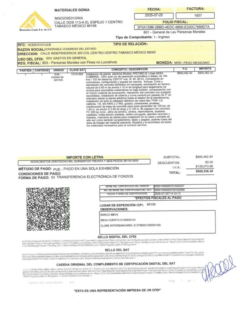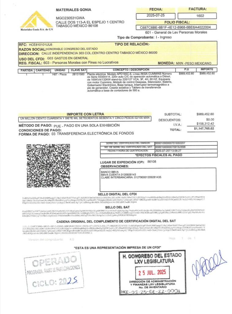 Un mes después, se adquirió la Planta por un monte de $1, 147, 765.02 (un millón ciento cuarenta y siete mil setecientos sesenta y cinco pesos con dos centavos), cantidad que ampara la factura 1602, con fecha de elaboración el 25 de julio del 2025, expedida por la empresa «Materiales GONIA».