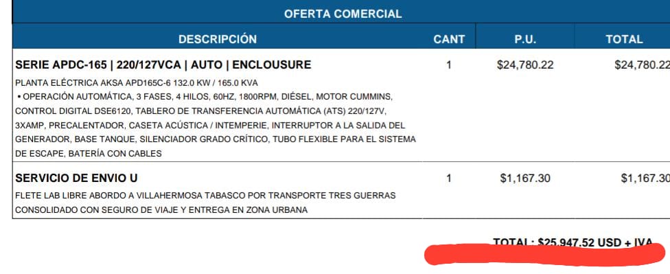 Pero eso no es solo lo raro, lo sospechoso; lo más grave del asunto, es que tenemos documentos en nuestro poder, cotizaciones de empresas serias, con la que se demuestra que el equipo adquirido por el Congreso, lo pagaron al doble de su costo real; tres empresas consultadas nos enviaron el precio de la Planta Eléctrica de capacidad similar a la adquirida por el Congreso, y esta tiene un precio en el mercado de medio millón de pesos.