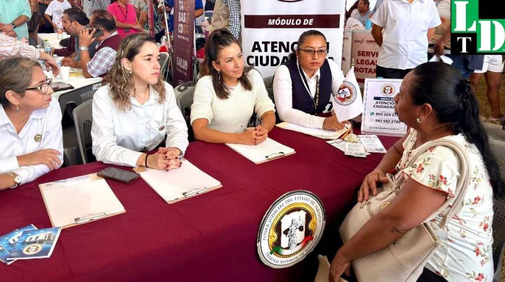 Villahermosa, Tabasco, México.- Un equipo de funcionarias del Tribunal Superior de Justicia (TSJ) despejó dudas de la población sobre temas jurídicos durante las Jornadas de Atención al Pueblo en Territorio, que este viernes encabezó el gobernador Javier May Rodríguez en el poblado Cocohital, en Comalcalco.