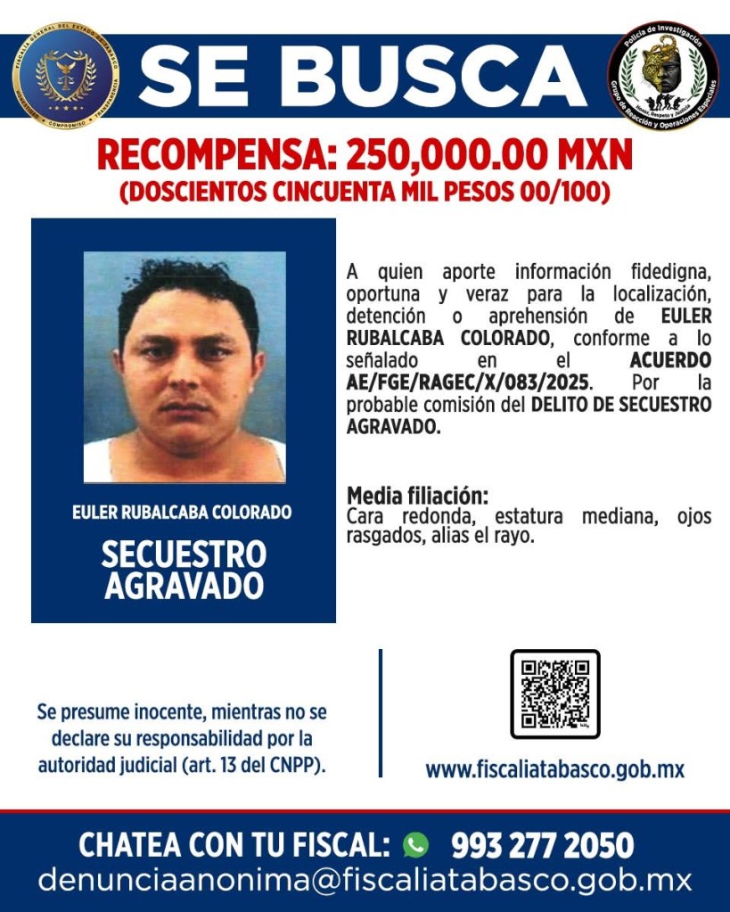 #OfrecimientoDeRecompensa La *Fiscalía del Estado de Tabasco FGETabasco*, ofrece la entrega de «RECOMPENSA» a quien otorgue información de *Euler Ruvalcaba Colorado, Alias ‘El Rayo’*, objetivo prioritario del Gobierno Federal y Estatal y de ser un Generador de Violencia en Chontalpa (Cárdenas, Huimanguillo, Cunduacán).Cómo recordara el Domingo 12 de Marzo de 2023, se reportó la fuga de CUATRO REOS del *Penal Las Palmas, del Municipio de Cárdenas*, e incluso se llevaron una PATRULLA 🚓 de la POLICÍA.Y se ha senalado que presuntamente con la ayuda de Personal de Custodia y del Director y ExJefe de Seguridad del Penal de Villahermosa *Santos Trinidad Tosca Alias El Ojo Salton»*, permitieron la «Fuga» luego de un «Motín» como distracción, en ese Centro Penitenciario.Y se da a conocer los DATOS, el cual se difunden en la siguiente FICHA de BÚSQUEDA.👇🏻/ #ReporteEspecial
