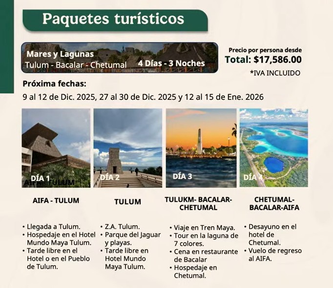 De los diversos paquetes, destacó el llamado “Mares y Lagunas”, que ofrece traslado desde el Aeropuerto Internacional “Felipe Ángeles” hacia Tulum, por Mexicana, para luego pasar cuatro días y tres noches entre Tulum, Bacalar y Chetumal, por un costo superior a los 17 mil pesos.