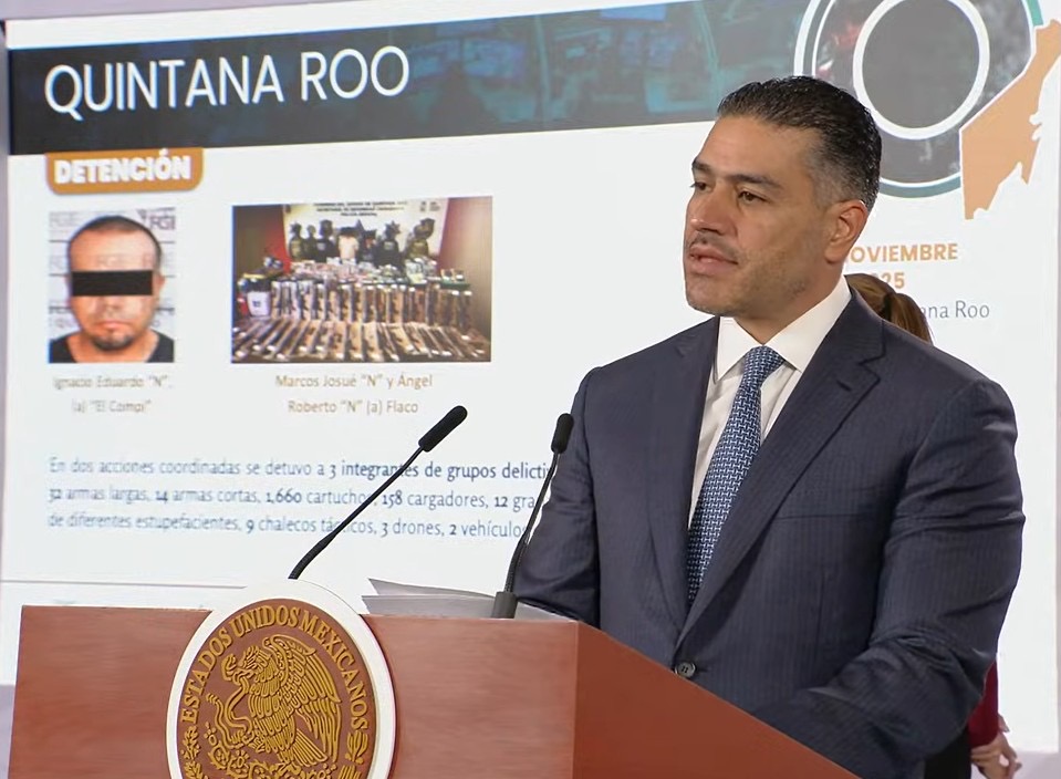Omar García Harfuch, titular de la Secretaría de Seguridad y Protección Ciudadana (SCPC) del Gobierno Federal, dio a conocer esta mañana la detención de Emiliano Alejandro N., alias “El H”, presunto cabecilla de un grupo delictivo para la zona norte de Quintana Roo, aunque, tal como las autoridades estatales, no mencionó la detención simultánea de un elemento de la Secretaría de la Marina.