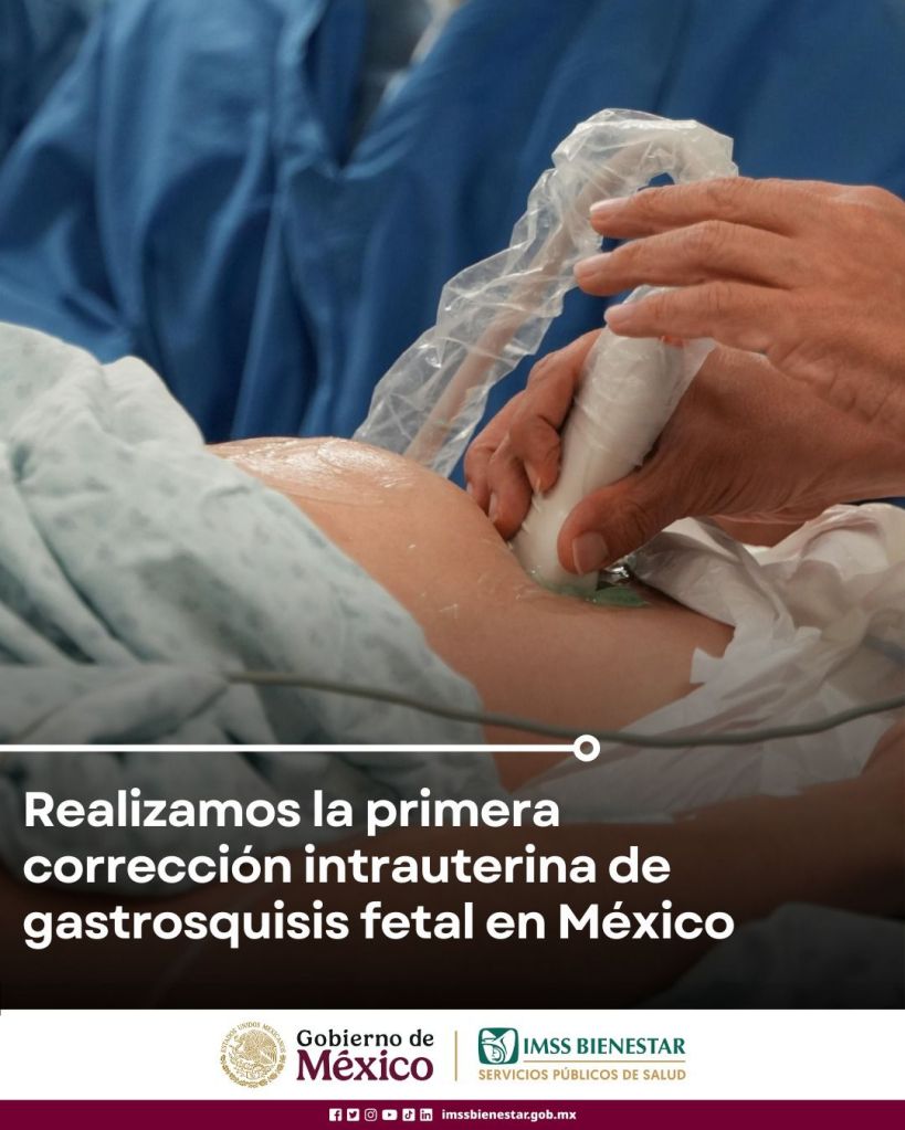 Por primera vez en México, un equipo multidisciplinario de IMSS Bienestar corrigió vía intrauterina una gastrosquisis fetal, malformación en la que los intestinos del feto salen del abdomen antes del nacimiento.