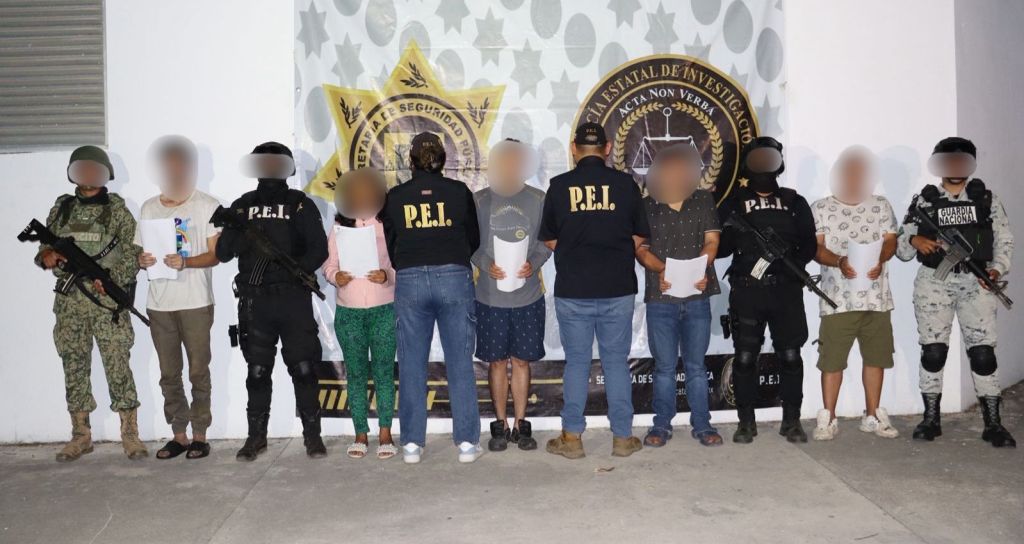 Las personas detenidas son Luis Antonio “N”, de 63 años, originario de Chiapas; Alfredo “N”, de 34 años, originario de Ticul, Yucatán; Verónica Rubí “N”, de 32 años, originaria de Chetumal, Quintana Roo; Carlos Alberto “N”, de 34 años, originario de Coatzacoalcos, Veracruz; y Keny Elías “N”, de 27 años, originario de Cancún, Quintana Roo.