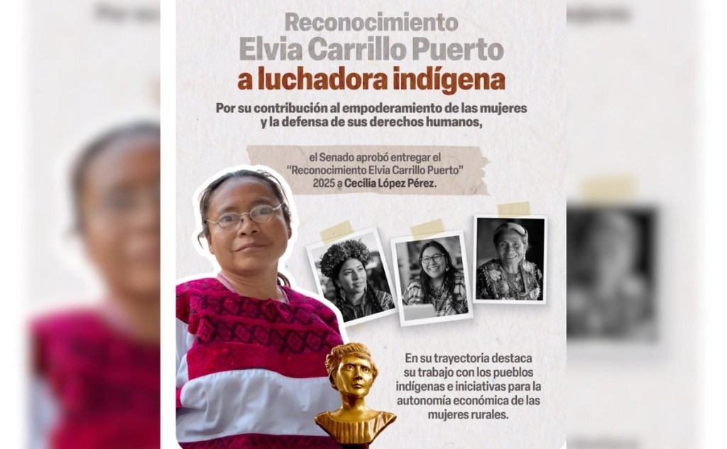 Por unanimidad, el Senado de la República acordó entregar el reconocimiento Elvia Carrillo Puerto, en su edición 2025 a Cecilia López Pérez, de origen tzotzil, quien durante los últimos 30 años ha realizado “un trabajo sostenido en la defensa de los derechos humanos de las mujeres y niñas indígenas de Chiapas.