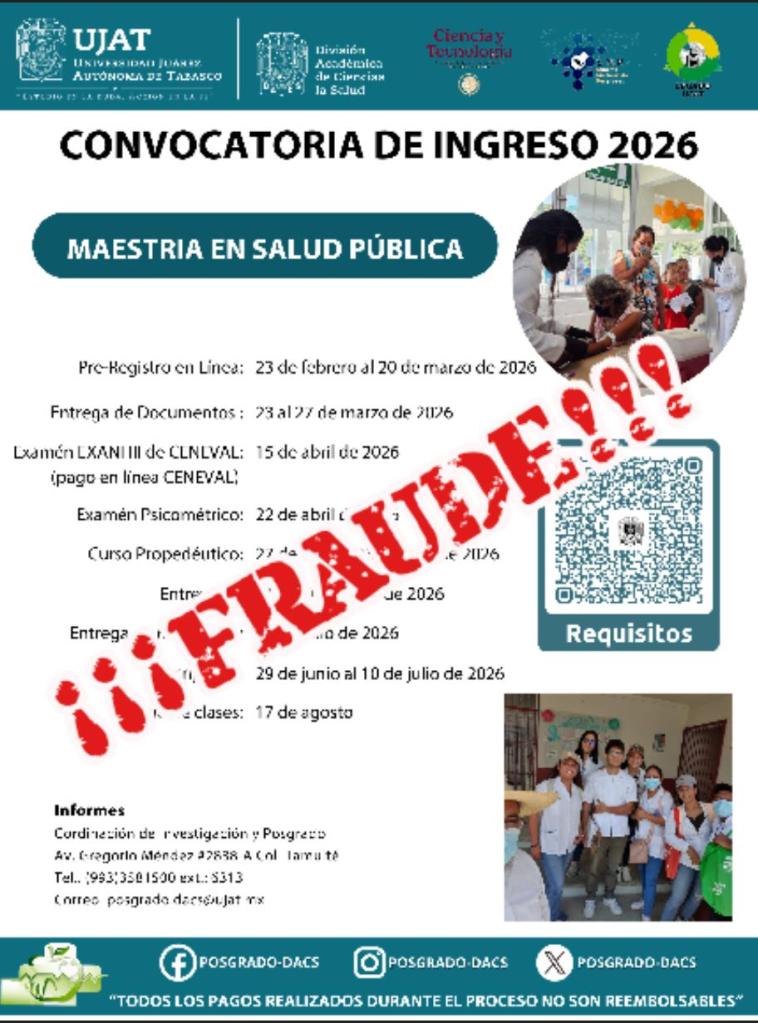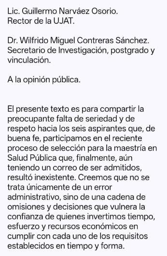 Agencia IDMx// Villahermosa, Tabasco, México.- Aspirantes aceptados a la «Maestría en Salud Pública» en la #UJAT, denuncian que fueron estafados por las autoridades de la máxima casa de estudios de Tabasco; solicitan que las instancias correspondientes actúen, que muestren seriedad en sus programas, o que de lo contrario, dejen de engañar a los aspirantes a alumnos de este tipo de postgrados, y cancelen esta Maestría.