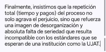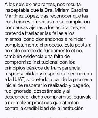 Por todas las irregularidades anteriores, abusos, fraude y robo, estos aspirantes hacen su denuncia pública, esperando que alguna instancia educativa superior ponga orden, y frenen este tipo de acciones que van en detrimento de la buena imagen que alguna vez mantuvo la Universidad Juárez Autónoma de Tabasco.